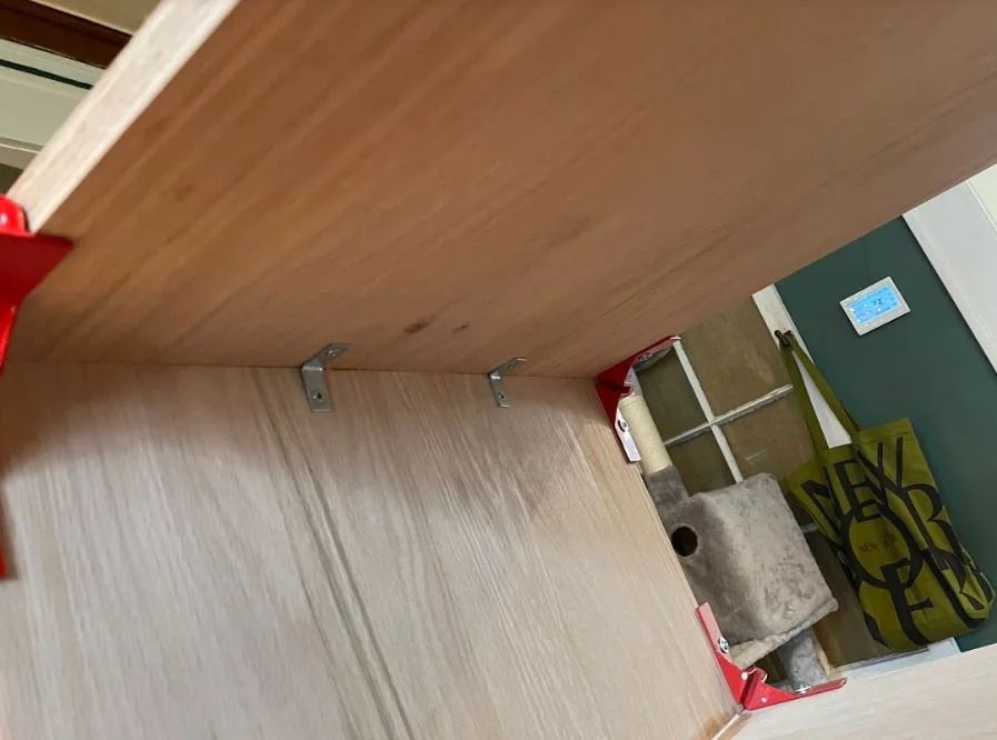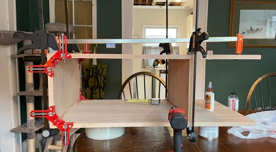 Below are some pictures I took during the making of the table. I took the wood to a family friend who had a table saw big enough to cut the 20” wood. In the top left, you can see the dry fit with clamps to make sure the wood fit together. Then we glued the piece and added L-brackets to the underside of the top of the table for some added support while remaining hidden. Once the glue had cured, I started applying the stain. I did two coats all around. After the stain was ready, I drilled the holes for some legs that I had purchased from McMaster-Carr.