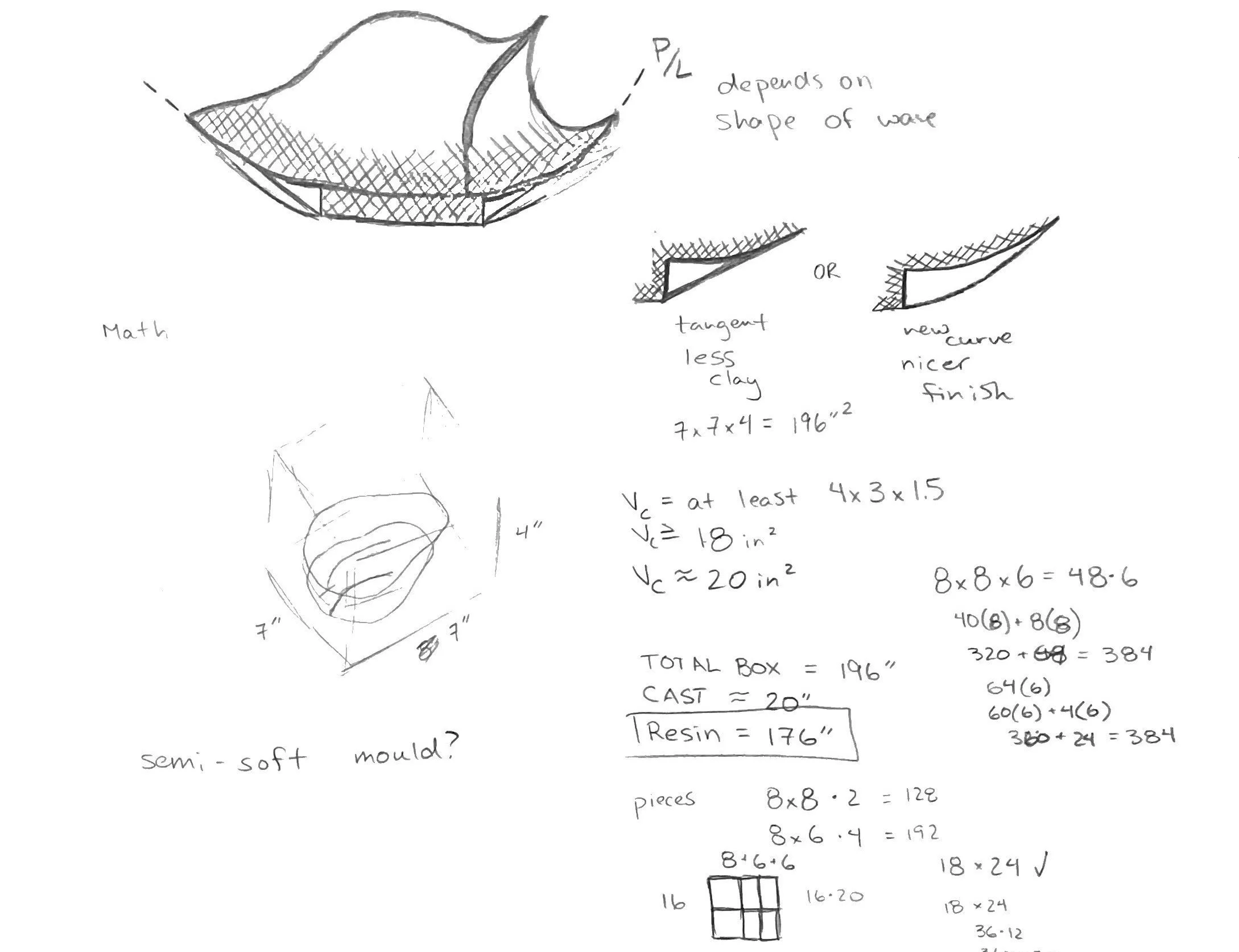 I started by doing some calculations and drawings. I had to figure out where the parting line would be for the mold, as well as how much silicone and resin I would need to make the mold and cast. I also needed to plan out how I was going to make the box to hold the silicone.