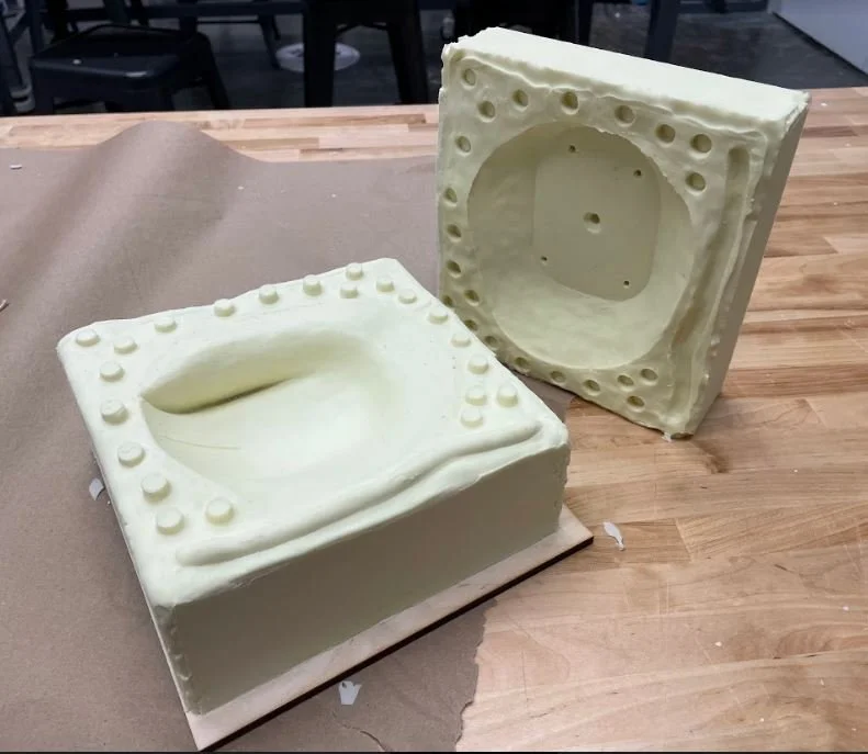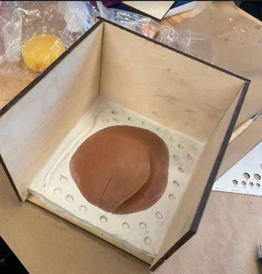 I filled clayed up to the parting line and constructed a box around it out of laser-cut plywood. I poured silicone over the top, waited for it to cure, then flipped it over, removed the white clay, and poured silicone over the bottom side.